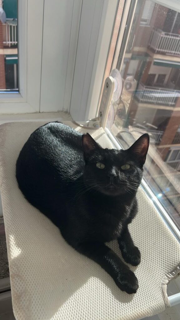 Diese schwarze Schönheit wurde von einer Frau in einem Bergdorf gefunden, in einer Gegend, die sich La Alpujarra (Spanien) nennt. Damals war Cleo noch ganz klein war. Sie war sehr dünn und so hungrig, dass sie sich trotz ihrer Scheu der Frau näherte, in der Hoffnung, etwas zu fressen zu bekommen. Die Dorfbewohnerin nahm Cleo, wie sie sie nannte, zu sich in Pflege, wo sie in Sicherheit vor den Gefahren des Straßenlebens auf ein neues Zuhause wartet.