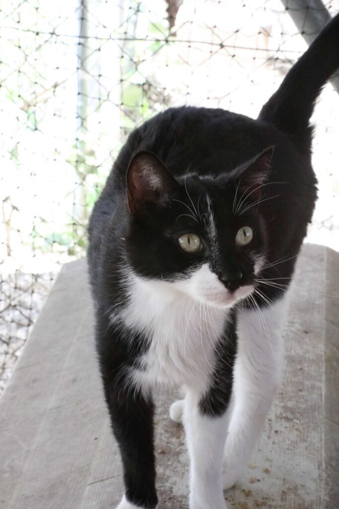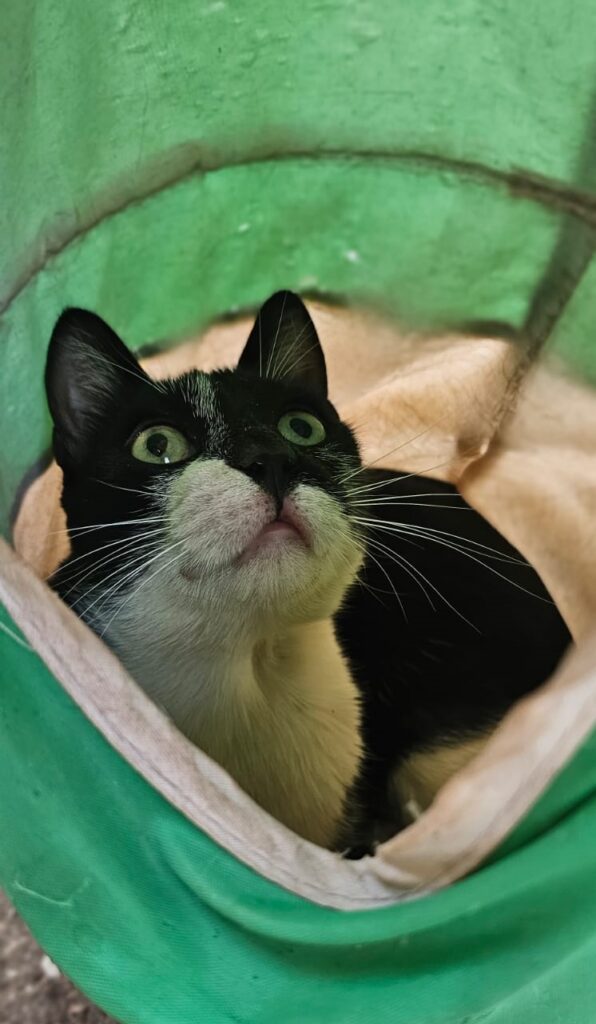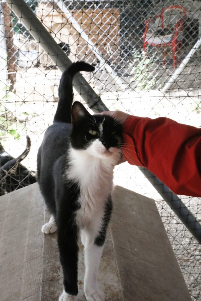 Im Refugio ist sie problemlos mit anderen Katzen durch die „Katzenstadt“ getobt. Derzeit lebt sie mit älteren, ruhigen Hunden zusammen.