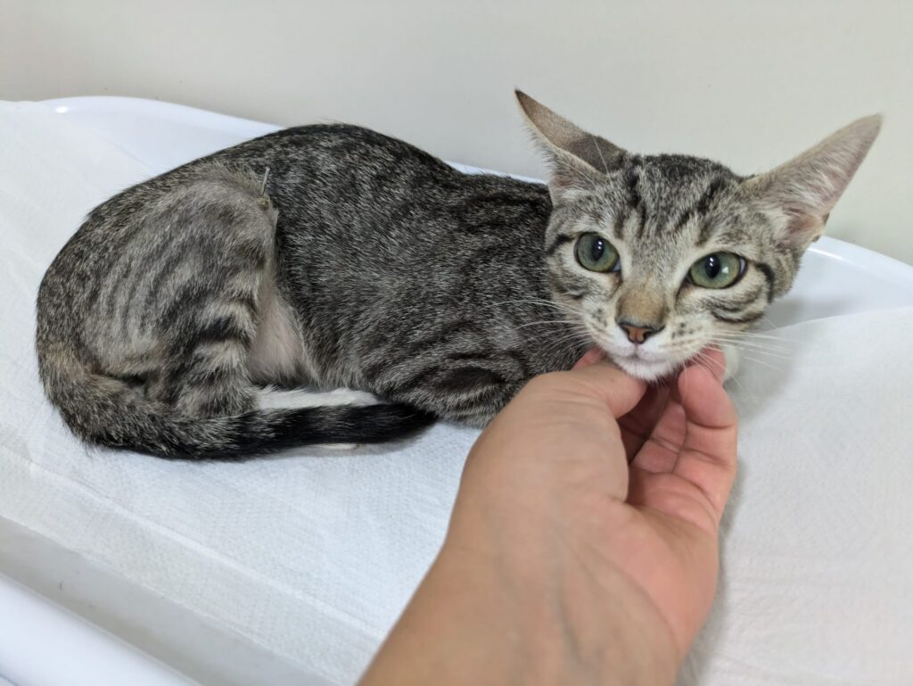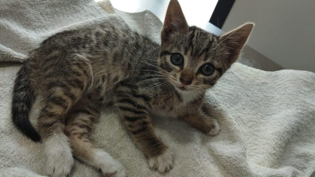 Wir erhielten einen Hinweis von einer Mitarbeiterin des Vereins, dass ein verzweifelter junger Mann um Geld bat, um eine kleine Katze zum Tierarzt bringen zu können. Er hatte sie einige Tage zuvor in der dunklen Nacht mitten auf einer Straße gefunden, wo sie sich nicht von der Stelle bewegen konnte. Er zögerte nicht, sie mitzunehmen und nach Hause zu bringen, aber er konnte die geforderte Summe nicht aufbringen. Da beschloss unser Verein, alle Kosten zu übernehmen und Pili zu helfen.