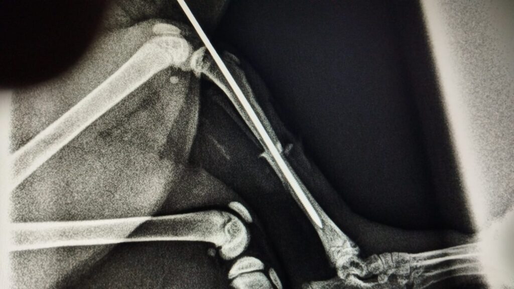 Sie wollte sich so sehr bewegen und Spaß haben, dass wir glauben, dass sie von einer Höhe wie einem Sofa oder Bett gefallen ist und dabei so viel Pech hatte, dass sie sich dabei ihr Beinchen gebrochen hat. Sie wurde notoperiert und erholte sich schnell und gut, ohne bleibende Schäden.